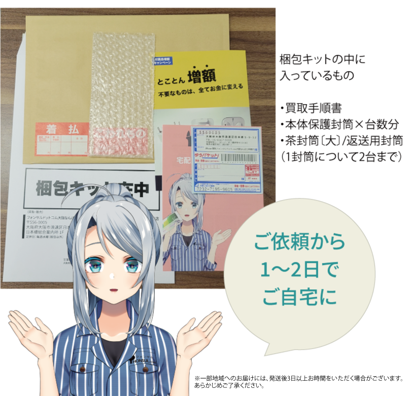 同封の「宅配買取発送の手順書」を参考に、本体の初期化をお願い致します。3台または4台お申込みされた場合は、返送用封筒が2つ届きます。