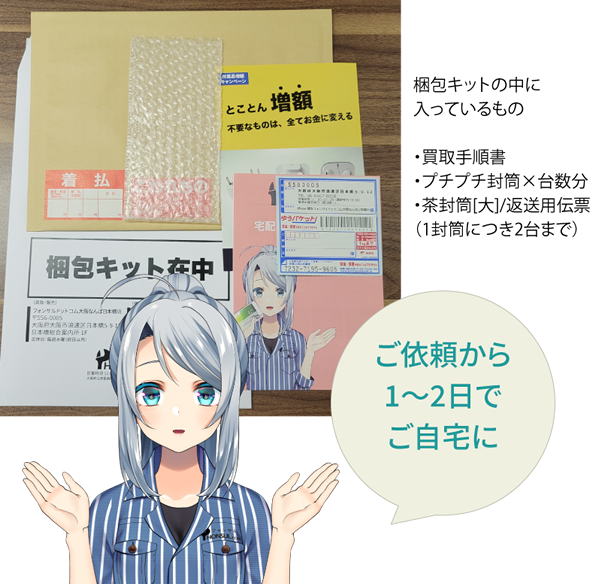 プチプチはお申し込み台数分を同封しておりますが、お申し込み後に買取台数が増えた場合はお客様にて緩衝材のご用意をお願いしております。