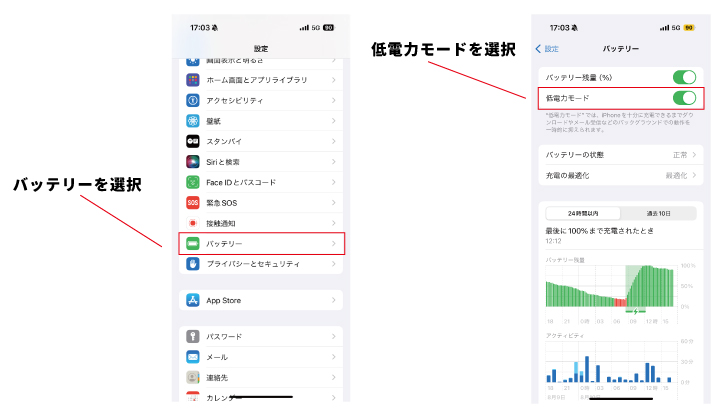 しばらくの間、バッテリーの消耗が早いかもしれませんが、以下の手順に従い、低電力モードへの切り替えなどを試してみましょう。