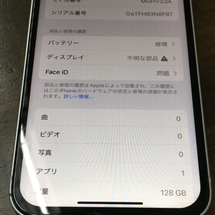 FaceID(顔認証)が使用できないことからCランク(ジャンク扱い)となり、さらにバッテリー劣化通知やアウトカメラに黒もやが‼️